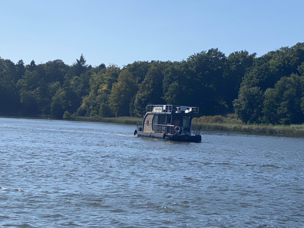 Als wir gerade abfahrtbereit waren, fiel uns auf, dass wir Brot zu kaufen vergessen haben. Den Liegeplatz für das Boot hatten wir aber schon abgegeben. Daher ist Tina zum Supermarkt gelaufen, während Benni und Alex eine Runde auf dem See gedreht und Tina dann im Vorbeifahren mit Brötchen wieder eingesammelt haben.