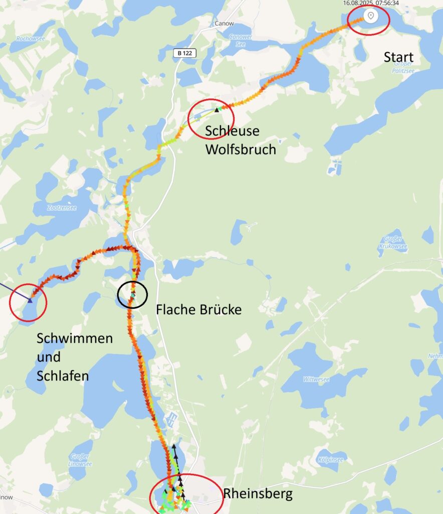 Die Brücken werden immer flacher. Die Brücke Schlaborn ist formell nur 10 cm höher als unser Boot. Ich kann das Video, das Tina und Benni vom Dach unseres Bootes gemacht haben leider nicht vernünftig hochladen vom Handy aus…