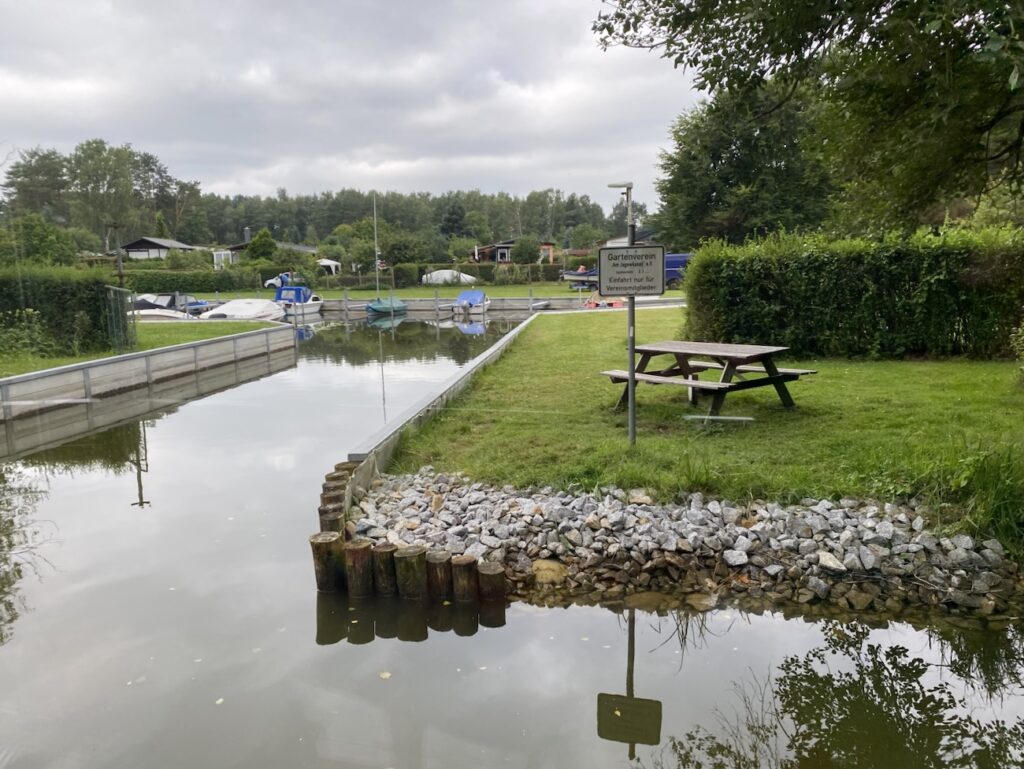 In den Kanälen ist recht viel Abwechslung geboten: Nicht nur mehrere Marinas sondern auch ein traumhaft nach hinten versetzter Kanuhafen unter den Bäumen mit winziger Einfahrt, sowie zB auch ein Hafen von irgendeinem Gartenverein taucht im Nirgendwo auf.