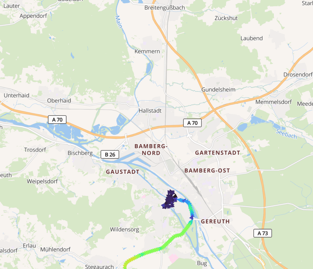 Aufdem Bild sieht man in bunt, wo wir mit dem Auto nach Bamberg eingefahren sind. Schwarz ist markiert, wo wir innerhalb von Bamberg raumgelaufen sind.